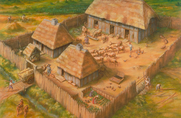 Ferme de Cap-Tourmente construite en 1626. Première exploitation agricole en Nouvelle-France. Illustration : Francis Back, anecdoteshistoriques.net