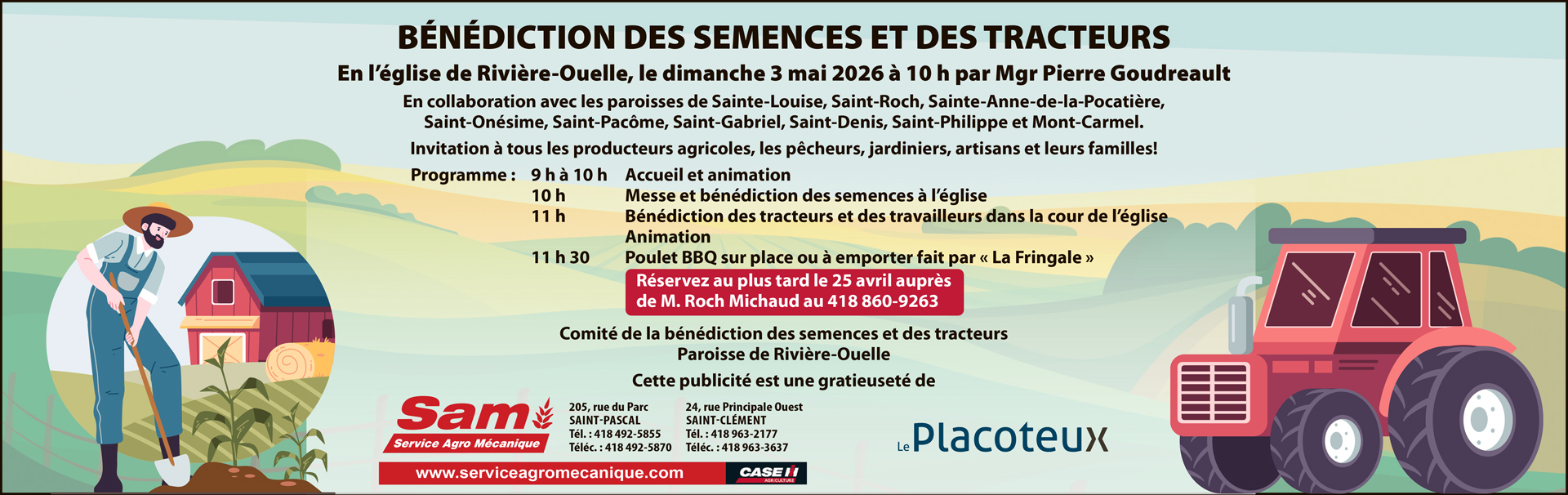 La messe sera chantée par Mgr Pierre Goudreau, dans le cadre du 75e anniversaire du diocèse Sainte-Anne-de-la-Pocatière. Les semences y seront bénies comme autrefois. Les agriculteurs, les pêcheurs, les jardiniers et les familles de partout sont invités à y participer. Après la célébration, les tracteurs seront bénis à leur tour. Un dîner au poulet barbecue permettra de prolonger la rencontre.